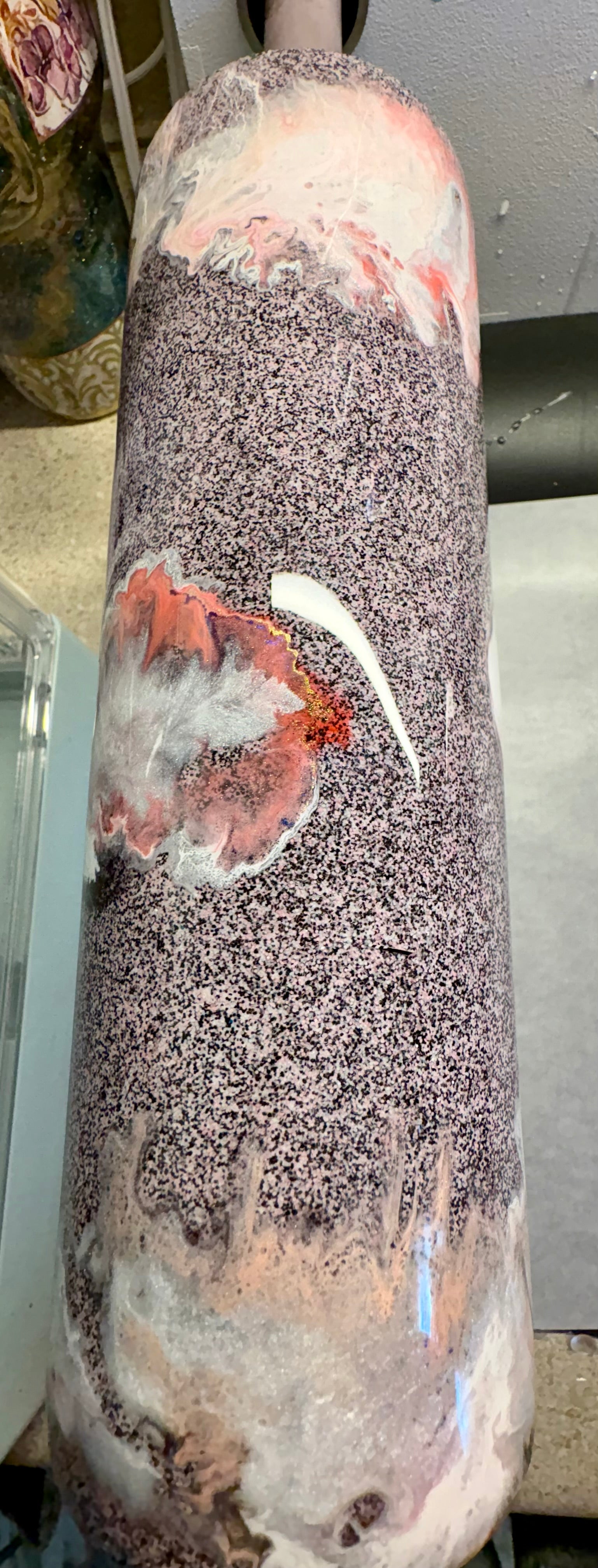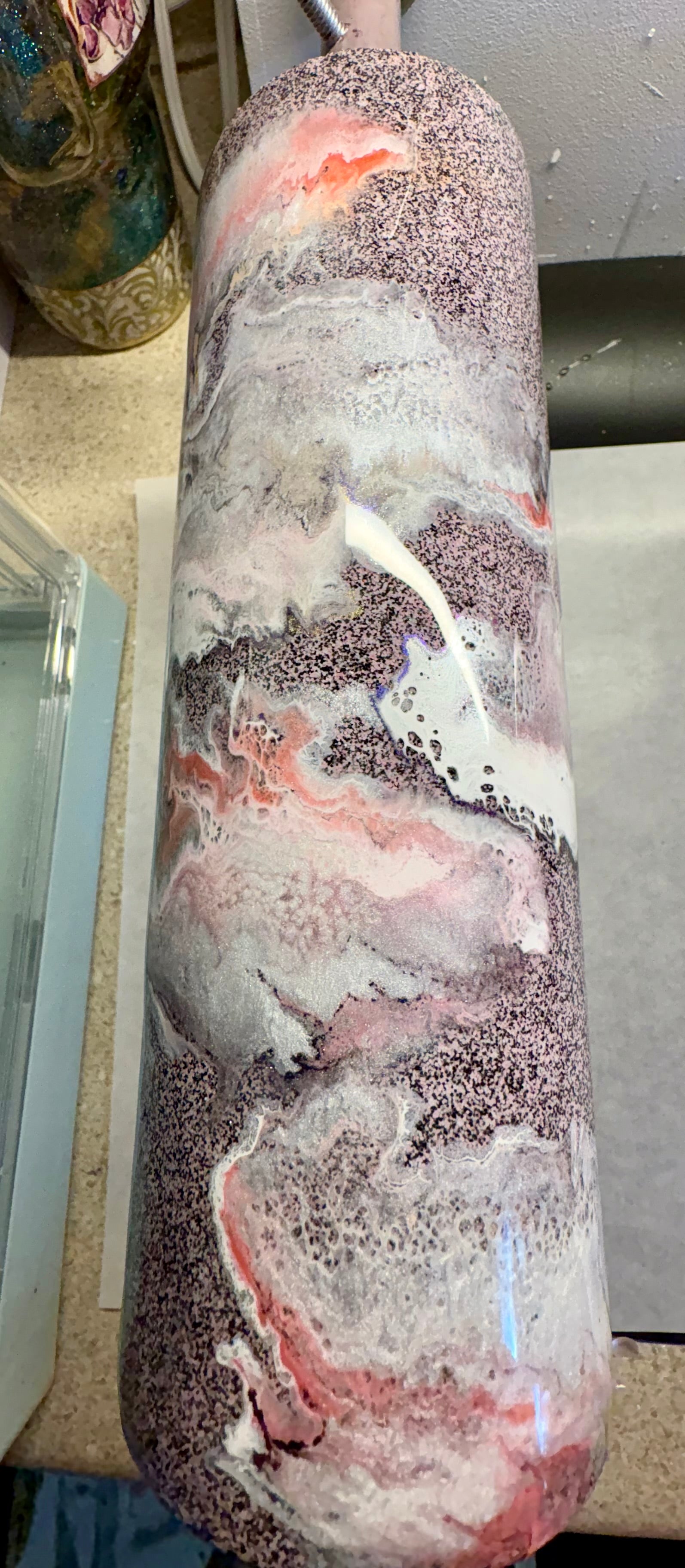 Double walled stainless steel glitter base with marble cloud effect in pink colors with white touches